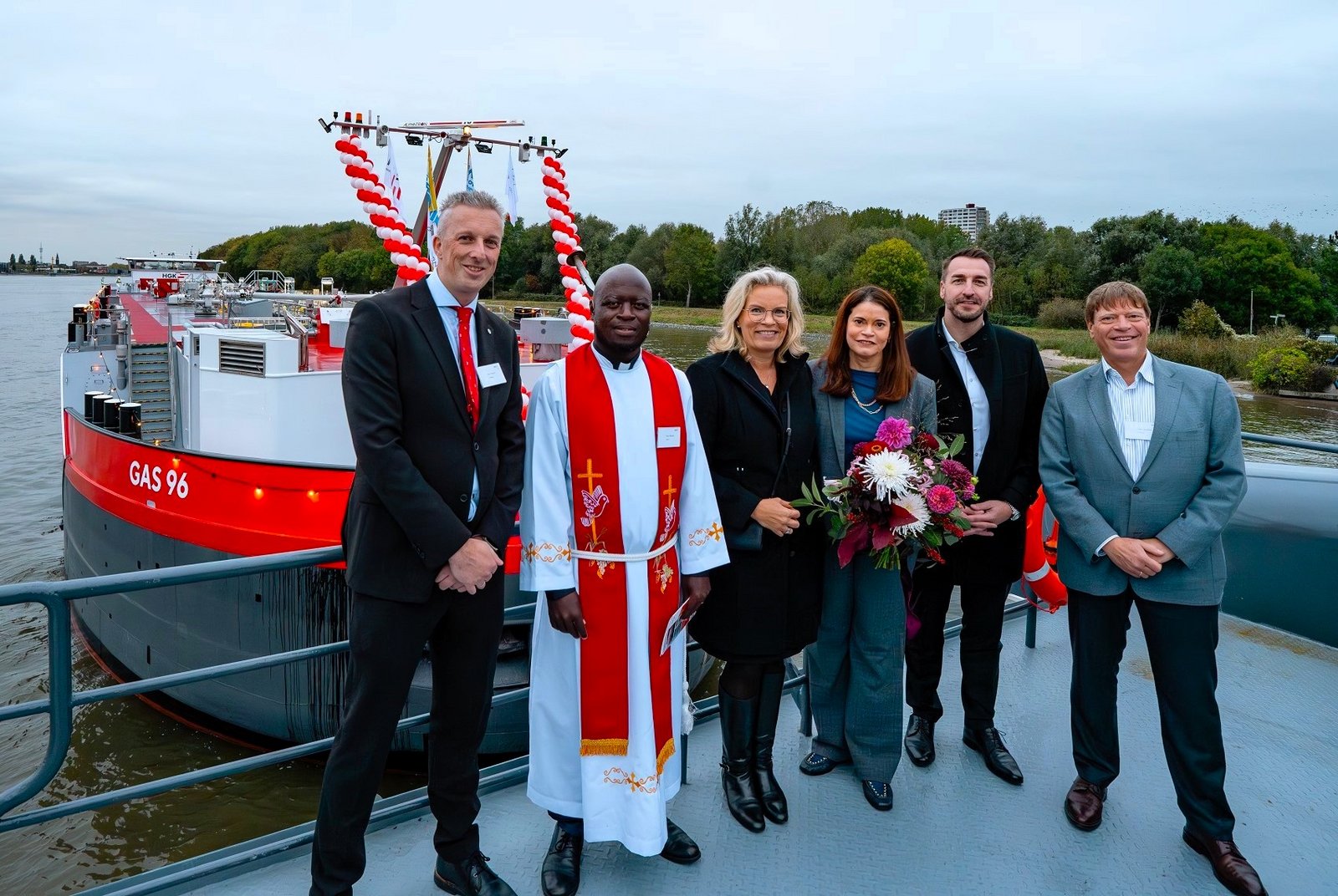 Bei der Taufe der „GAS 96“ waren in Rotterdam dabei (v. l): Bjorn Krijgsman, Buyer Logistics Barging EU bei LyondellBasell; Reverend Daniel Odhiambo; Anke Bestmann, Director Gas Shipping & Managing Director HGK Gas Shipping GmbH; Yarelis Hernandez, LYB Vice President of Global Intermediates & Derivatives Manufacturing; Steffen Bauer, CEO der HGK AG; Folkert Bloembergen, Director Global Ocean, Inland Waterways & Storage Procurement bei LyondellBasell