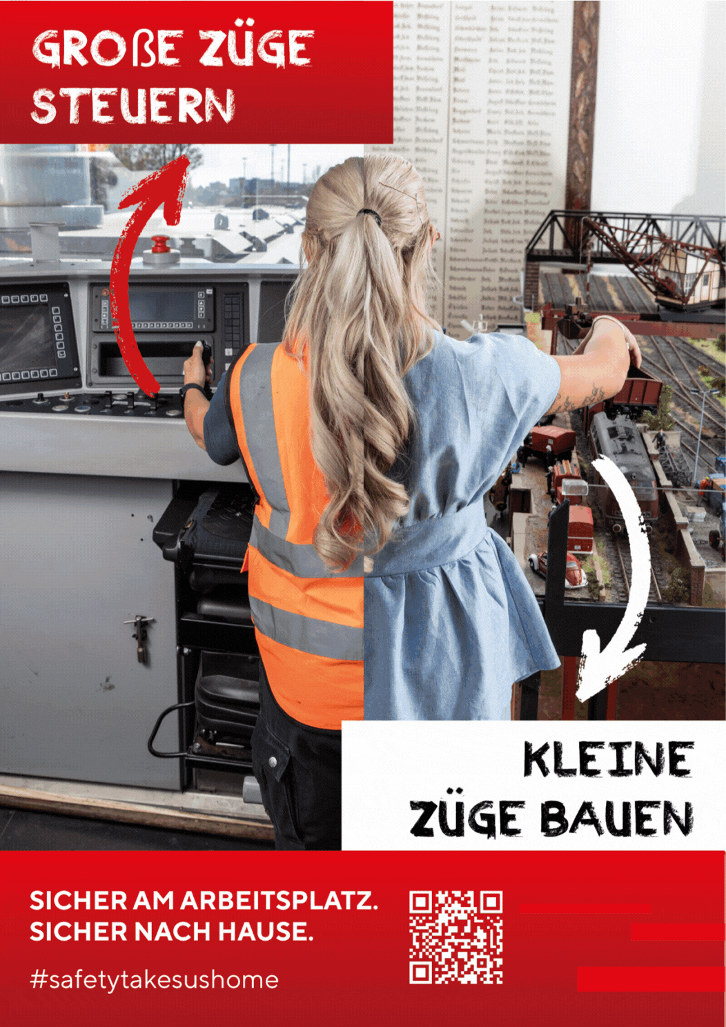 Unsere Plakate erzählen genau diese Geschichte. Jede Collage zeigt zwei Seiten eines Lebens: links die Welt der Arbeit, rechts die Welt der Freizeit. Ein Gleisbauer mit Funkenflug – und derselbe Mensch am Grill. Eine Triebfahrzeugführerin auf der großen Bahn – und dieselbe Person zu Hause an der Modelleisenbahn. Ein Staplerfahrer, der Papierrollen bewegt – und ein Künstler an der Staffelei.